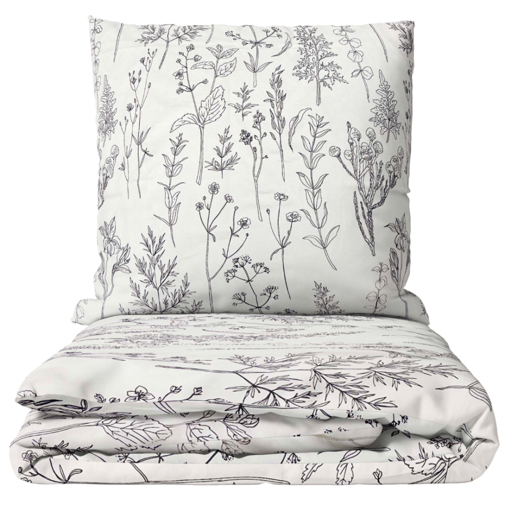Naturweißfarbene Bettwäsche ist mit einem minimalistischen botanischen Linienmuster in Dunkelviolett verziert. Von Hellgrau bis Dunkelviolett – für ein besonders sanftes, harmonisches und beruhigendes Design, das perfekt zu einem modernen Interieur passt, das Natürlichkeit und Ästhetik sucht.
