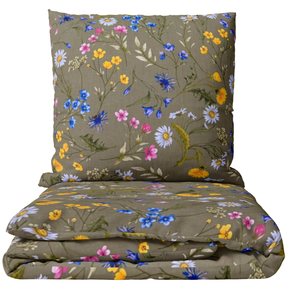Das grüne Bettwäsche-Set zeichnet sich durch einen sanften Olivton und ein reiches Muster aus kleinen Wiesenblumen aus. Weiße Gänseblümchen, Kornblumen, gelbe Löwenzahn und rosa Wildblumen schaffen eine natürliche und romantische Atmosphäre. Der dezente grüne Hintergrund spendet Ruhe, während die farbenfrohen Blüten Leben und Wärme hinzufügen. Das Design wirkt leicht, frisch und sehr natürlich und passt perfekt in moderne wie auch gemütliche Schlafzimmer.