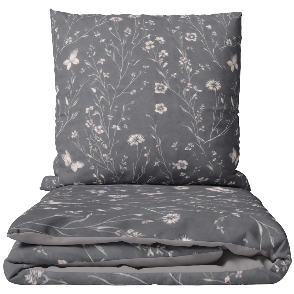 Dunkelgraues Bettwäsche-Set mit zartem Blumenmuster. Das Set besticht durch einen tiefen Graphitton, der mit feinen hellen Blüten- und Schmetterlingsmotiven gestaltet ist. Die floralen Elemente sind harmonisch verteilt und schaffen eine ruhige, elegante Ausstrahlung. Der Kontrast zwischen dunklem Hintergrund und hellen Details verleiht dem Design Tiefe und Charakter.